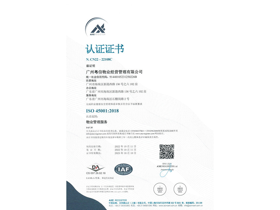 公司早在2002年9月就按照ISO9001:2000標(biāo)準(zhǔn)要求,在全公司范圍內(nèi)建立質(zhì)量管理體系,并于2003年5月通過(guò)了國(guó)家認(rèn)證機(jī)構(gòu)的認(rèn)證審核,獲得質(zhì)量管理體系認(rèn)證證書,2009年經(jīng)過(guò)ISO9001:2008改版認(rèn)證,2022年在持續(xù)新冠疫情影響下,公司上下仍不忘修煉內(nèi)功,通過(guò)了國(guó)家認(rèn)可的認(rèn)證機(jī)構(gòu)ISO9001:2015質(zhì)量管理體系改版審核以及新增ISO14001:2015環(huán)境管理體系、ISO45001:2018職業(yè)健康安全管理體系、GB/T26047.9-2006物業(yè)管理五星服務(wù)審核認(rèn)證。多年來(lái),公司一直保持和持續(xù)改進(jìn)公司的質(zhì)量管理體系,使公司物業(yè)管理服務(wù)過(guò)程科學(xué)化、系統(tǒng)化、規(guī)范化并處于受控狀態(tài)。